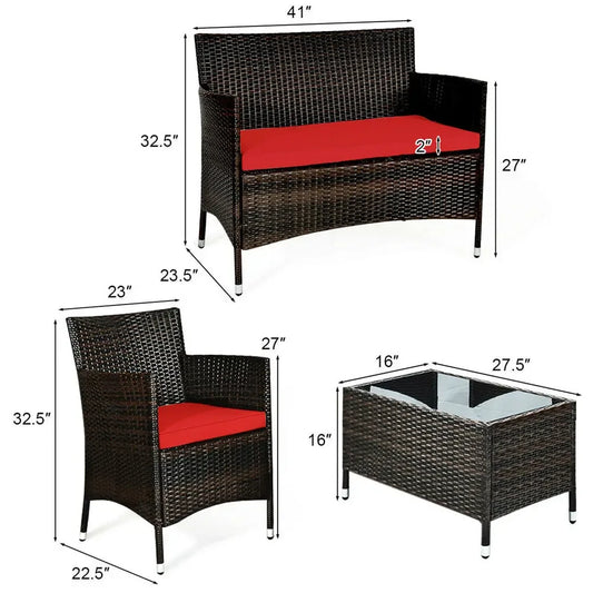 8PCS Weather and Sun Proof Rattan Patio Conversation Set w/ Red Cushion