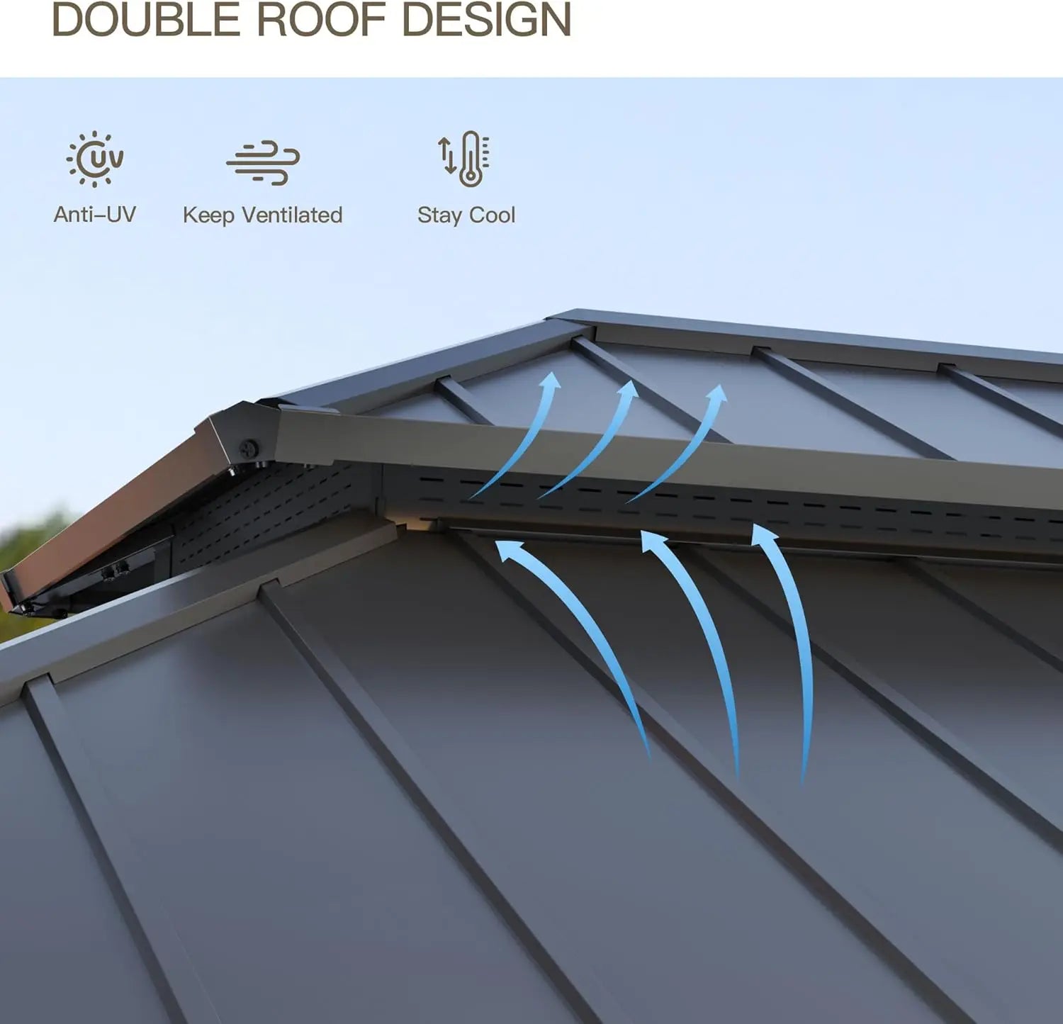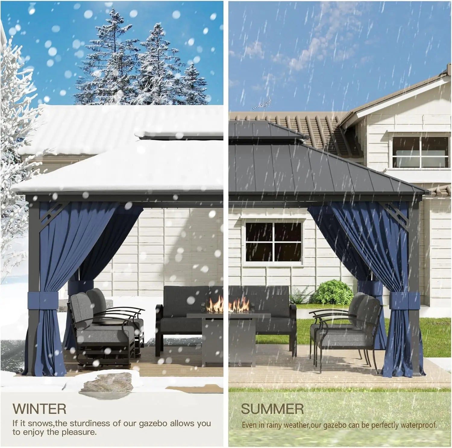 This gazeobo has double roofs , sturdy Frame with triangular designs. Framework Strengthenen, solid structure, insect and mosquito resistant, wind and dust proof. If it snows the sturdiness of the gazebo allow enjoyment. Summer even in rainy weather the gazebo can be perfectly waterproof. Shippping ub six different boxes at different times.