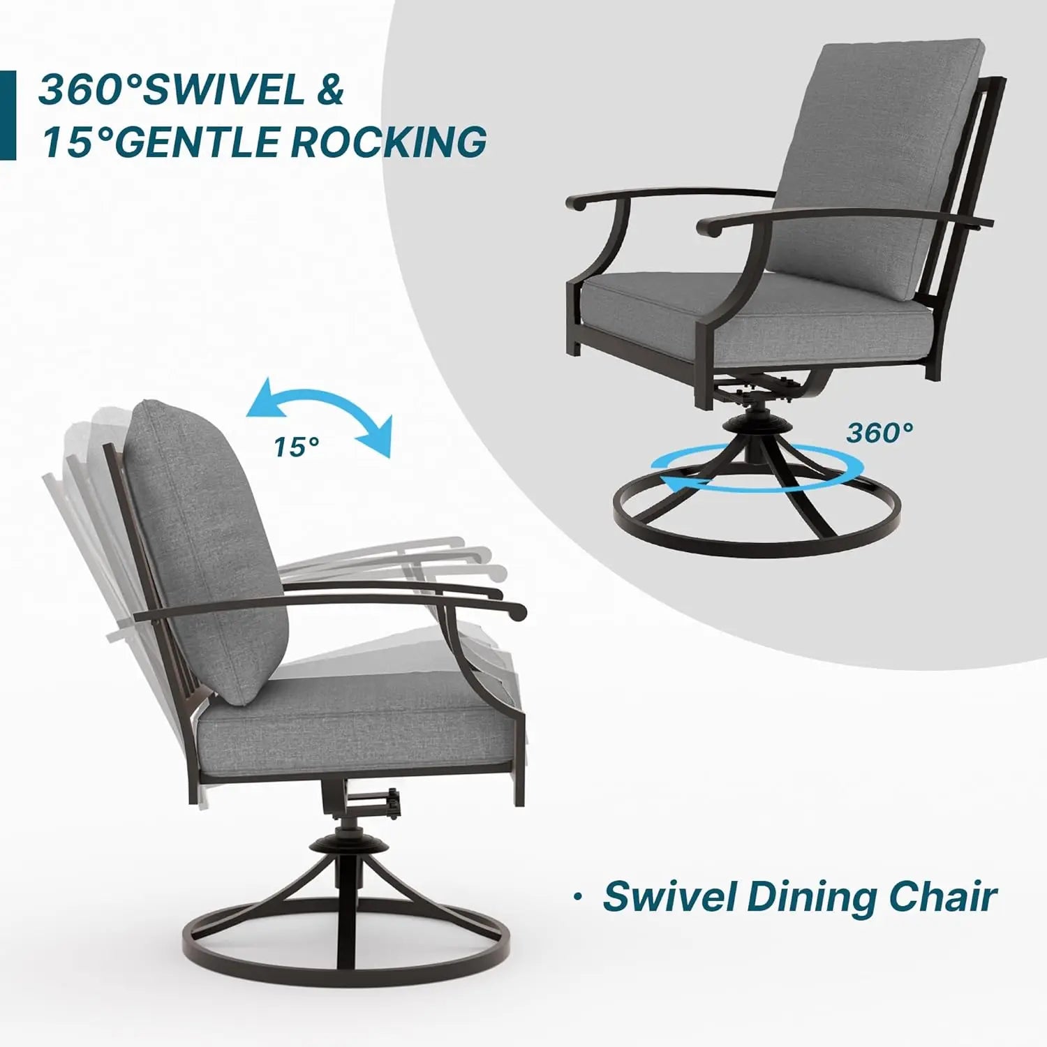 - OUTDOOR CHAIRS: We have two types of chairs to choose from, single dining chair and swivel dining chair. You can buy different combinations according to your preference. Each patio chairs comes with thick cushions. The seat of the swivel chair can be swiveled 360° from side to side and tilted 15° from front to back.