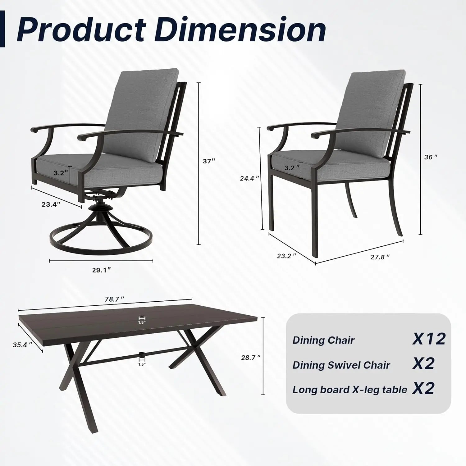 - DINING SET: 16 pieces outdoor dining set includes 2 rectangular metal dining tables, 12 single chairs, 2 swivel chairs. Table dimension 78.7in X 35.4in X 28.7in, single Chairs dimension 36in X 27.8in X 23.2in, swivel chairs dimension 37in X 29.1in X 23.4in. This dining set is perfect for placing in your yard.