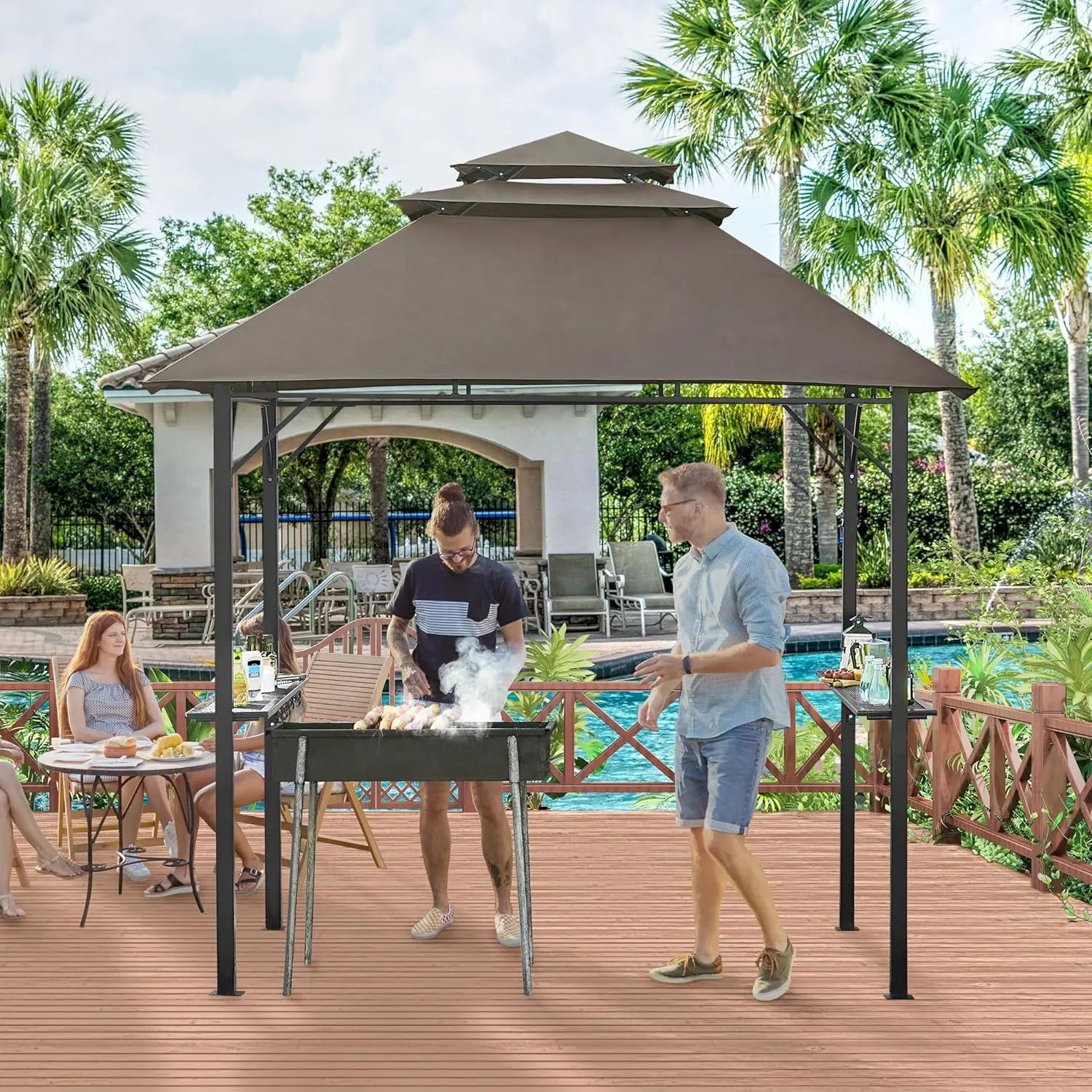 8x5' 3-Tier Grill Gazebo for Cookouts with Height-Adjustable Shelves & 10 S-Shaped Hooks & Built-in Bottle Opener, Brown